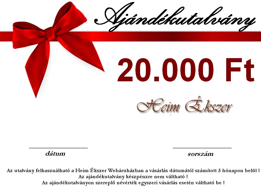 Tökéletes meglepetés lehet a 20.000 Forint értékű ajándékutalványunk, ha olyan maradandó értéket szeretne ajándékozni, ahol az ajándékozottra bízható az ékszer kiválasztása, a választás lehetősége. - Ajándékutalvány - 20.000 Ft-os ajándékutalvány |