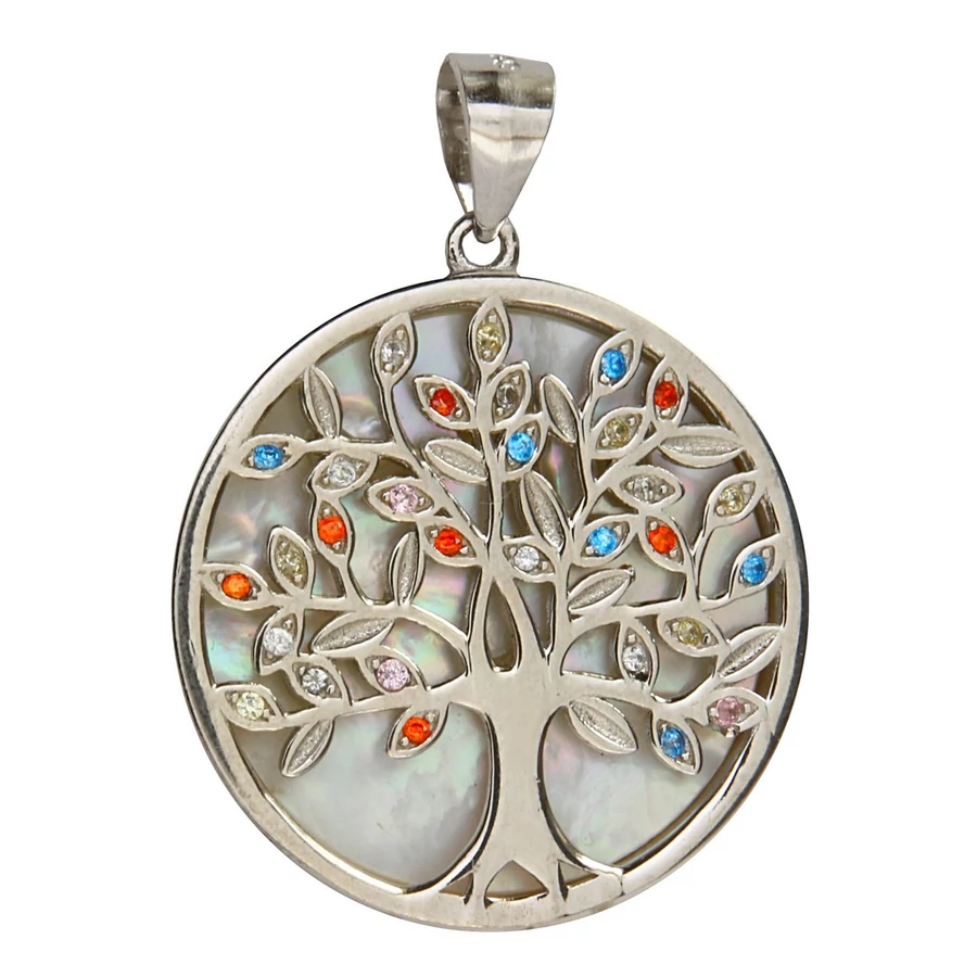 Színes kövekkel díszített ezüst Életfa medál - különleges darab, amelynek hátoldalát elegáns gyöngyházbetét teszi még egyedibbé. Egy ékszer, amely egyszerre sugároz energiát, eleganciát és finom spirituális üzenetet. - Női ezüst medálok - Életfa medál gyöngyház betéttel, ezüst ékszer |