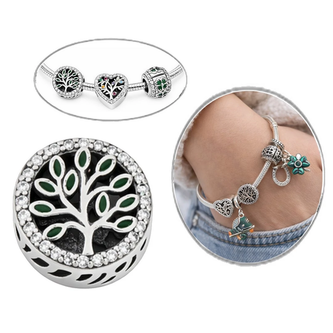 Az ezüst charm, medál díszítése : zöld színű zománcos levelekkel díszített életfa körben apró cirkónia kövekkel