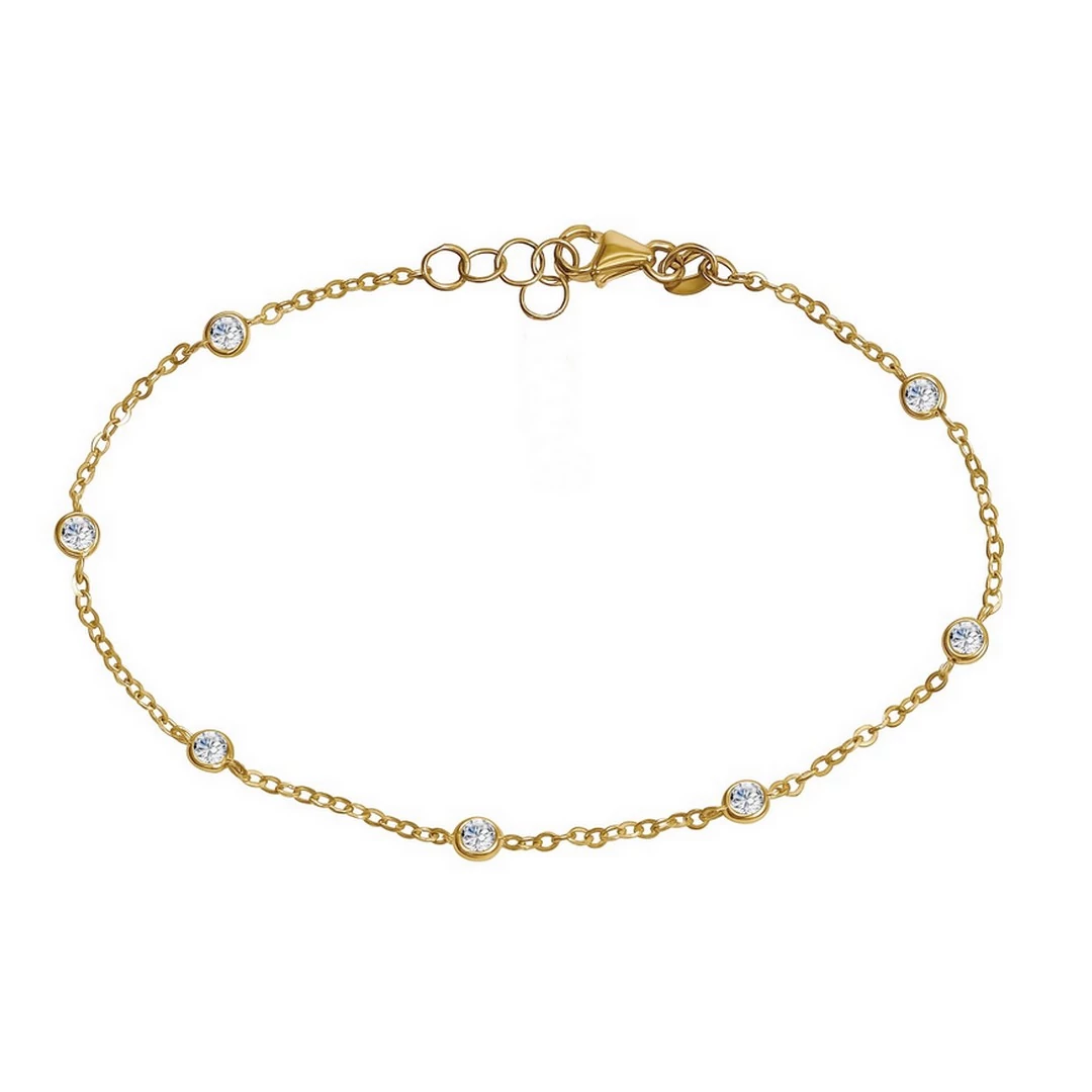 Kifinomult szépség jellemző erre a gyönyörű, szikrázóan csillogó kövekkel díszített arany karláncra. - Sárga arany karkötők - Körben köves vékony karlánc, arany ékszer |