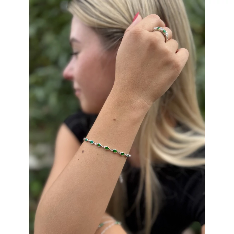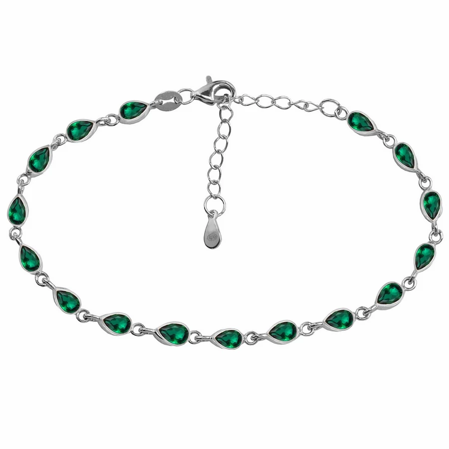 Kiegyensúlyozott, kedves hölgyek kedvence ez a körben zöld csepp köves ezüst karkötő, hiszen a zöld szín jótékony stresszoldó hatása kedvezően hat viselőjének kedélyállapotára, jókedvet és vidámságot varázsolva a hétköznapok egyhangúságába, a karkötő nagy előnye, hogy a zöld csepp kövek körben helyezkednek el, így a karlánc mintája folyamatosan látszik, szikrázó zöld csillogása pedig magához vozza a tekintetet - Női ezüst karkötők, bokaláncok - Körben zöld csepp köves karkötő, ezüst ékszer |