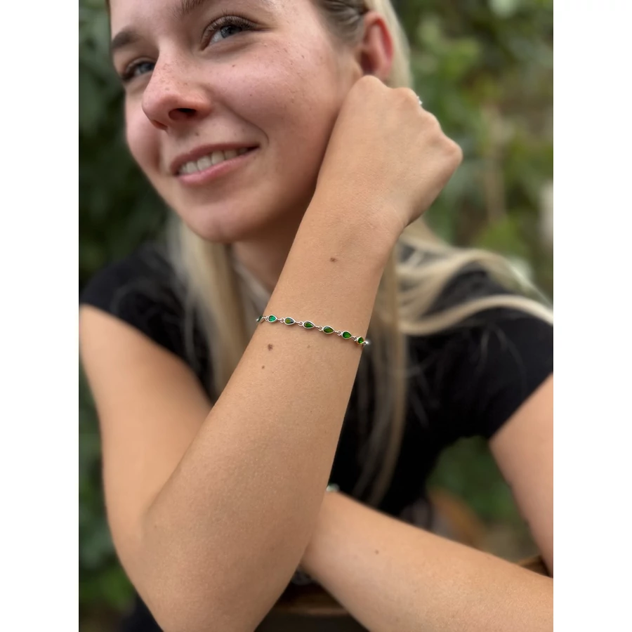 Ezt a gyönyörű ezüst karkötőt a foglalt zöld csepp kövek csillogása teszi különlegessé. Ajánljuk mindazoknak, akik szeretik csillogást, ami sosem halványul el. Gyönyörű ékszer nagyon jó áron, ezért ideális lehet : ballagási ajándéknak, születésnapi ajándéknak, névnapi ajándéknak, anyák napi ajándéknak, vagy akár a szeretet ünnepére : karácsonyi ajándéknak is.