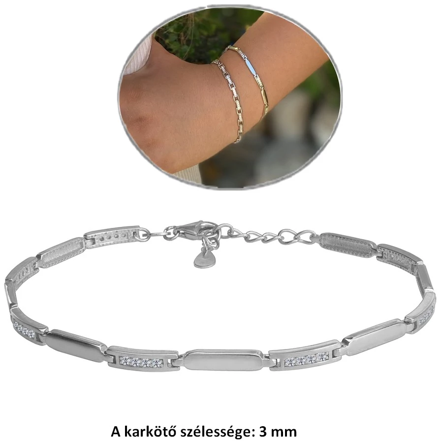 Az ezüst karkötő díszítése : a karkötőn váltakozva fényes ezüst rész és cirkónia kövekkel díszített rész.
