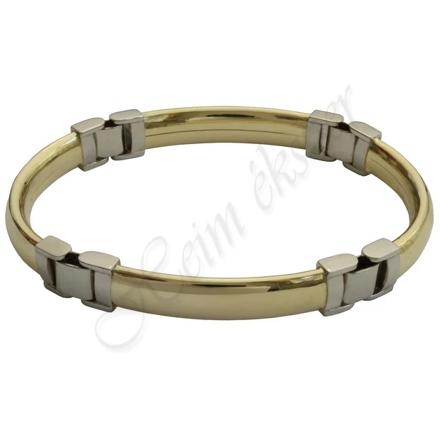 Az arany karkötő díszítése : sárga arany vastag szelvények, a szelvények végén fehér arany végződés és fehér arany összekötő szemek
