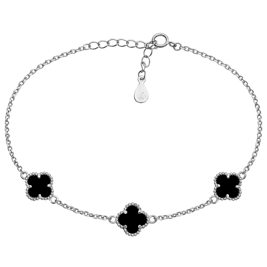 Négylevelű fekete lóherékkel díszített ezüst karkötő népszerű szerencsehozó kabala ékszer. Amellett, hogy fiatalos és divatos, a fekete színnel kifejezhetjük önmagunkat, hangulatunkat, erőnket, eleganciánkat.