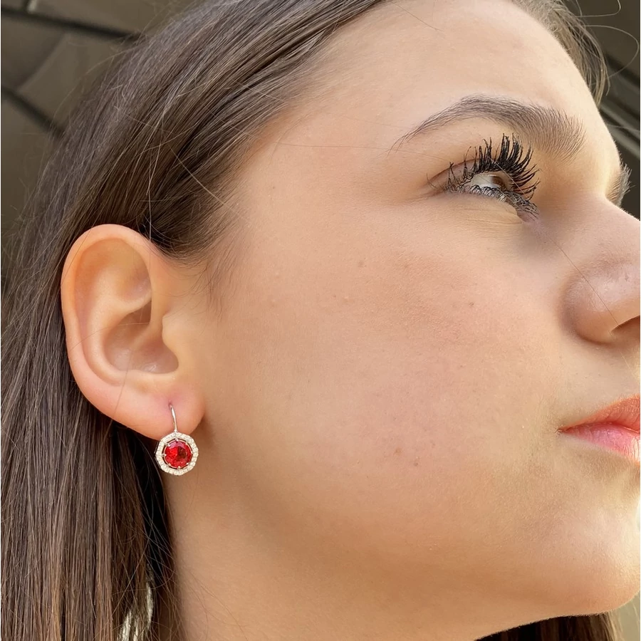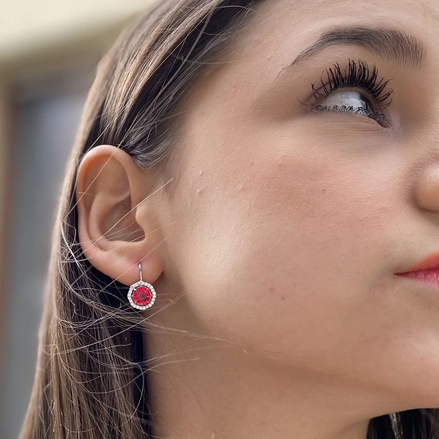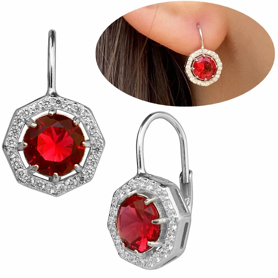 Az ezüst fülbevaló díszítése : középen szintetikus rubin kő, körülötte szikrázóan csillogó apró cirkónia kövek.
