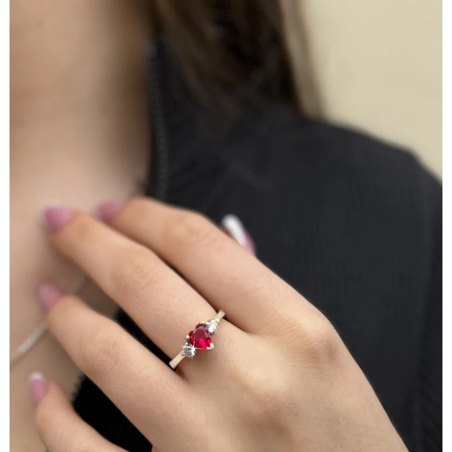 Az ezüst gyűrű díszítése : középen 1 db nagyobb szikrázóan csillogó szív formára csiszolt 6 x 6 mm nagyságú piros cirkónia kő mellette 1-1 db 3 mm átmérőjű cirkónia kő biztonságos karmos foglalatban foglalva