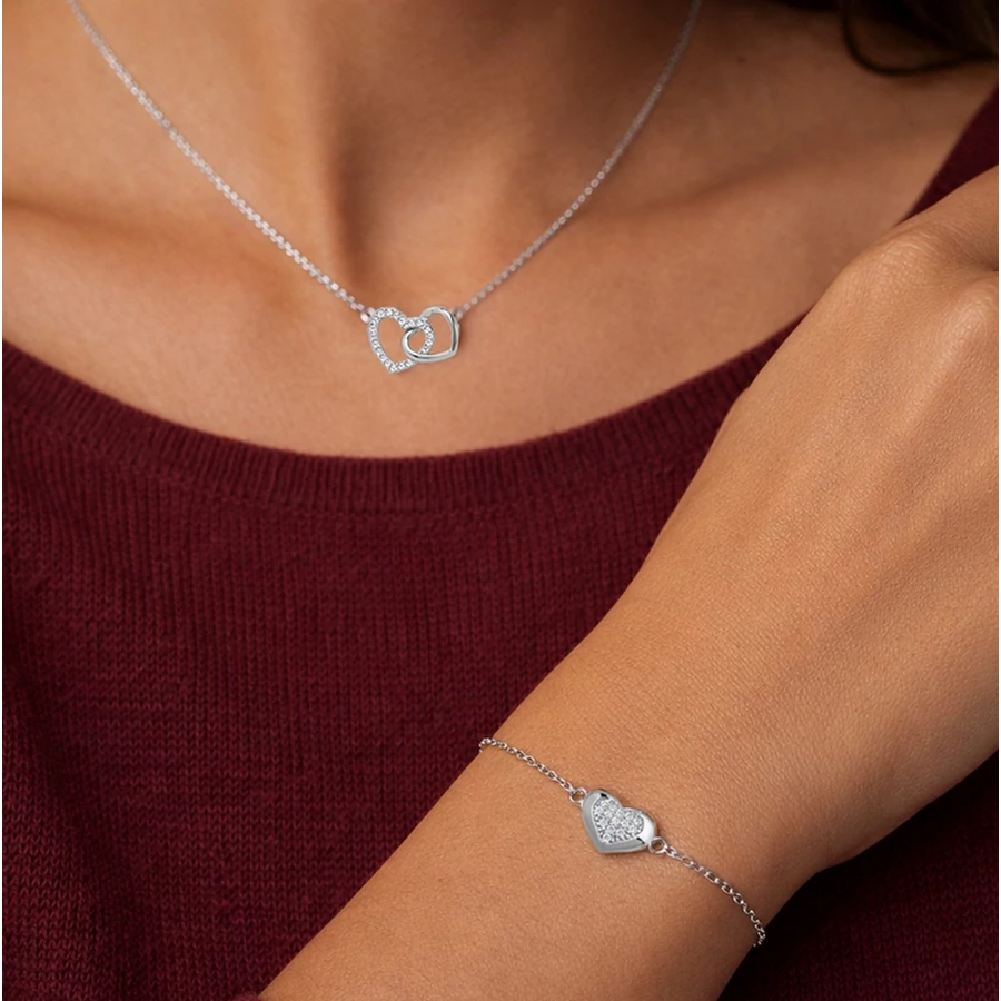 Az ezüst karkötő díszítése : a szív medált szikrázóan csillogó apró cirkónia kövek díszítik
