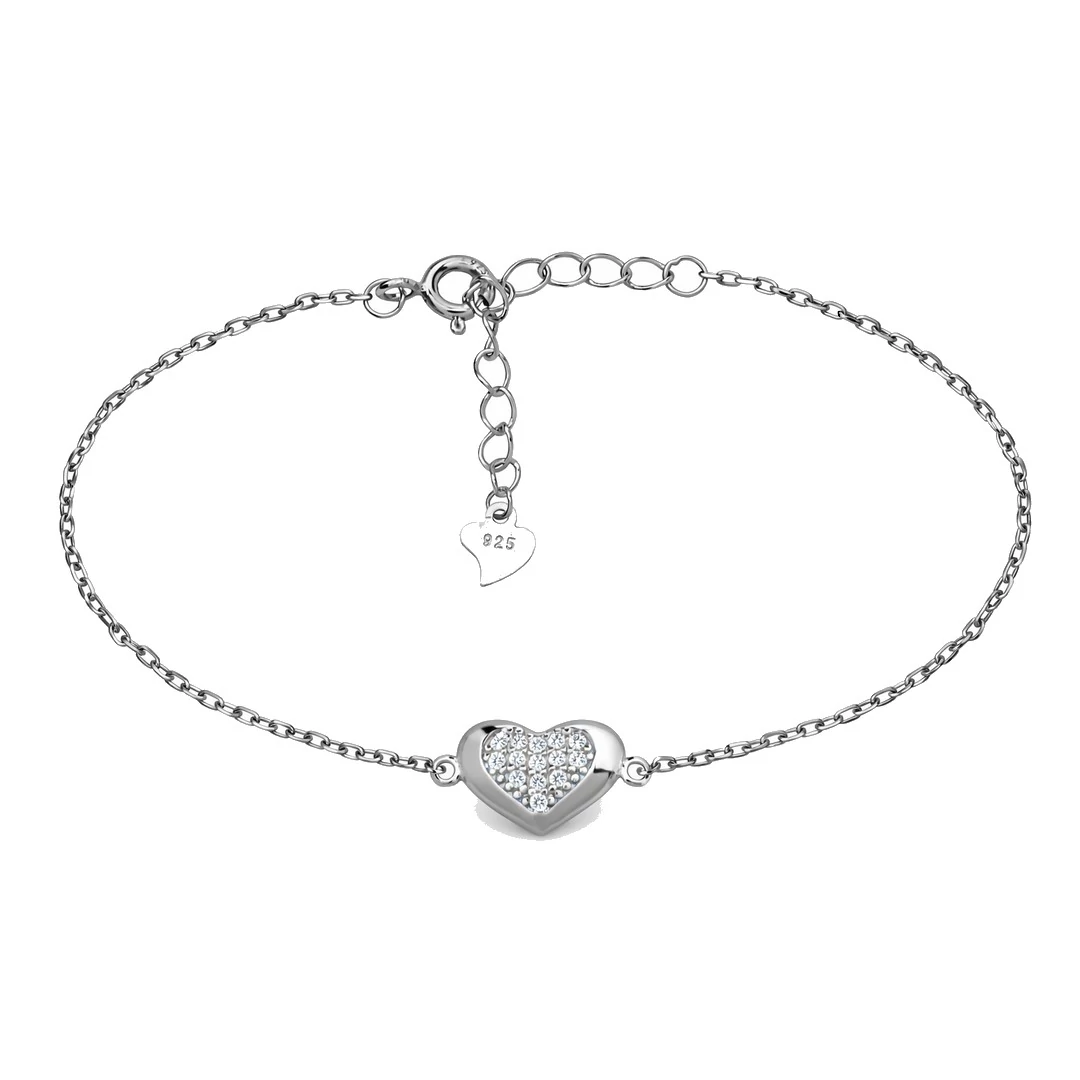 Elegáns és nőies ezüst karkötő apró, szív alakú medállal, melyet finoman csillogó cirkónia kövek díszítenek. A vékony lánc könnyed viseletet biztosít, így tökéletes mindennapi használatra és különleges alkalmakra egyaránt. - Női ezüst karkötők, bokaláncok - Szív medállal díszített karkötő, ezüst ékszer |