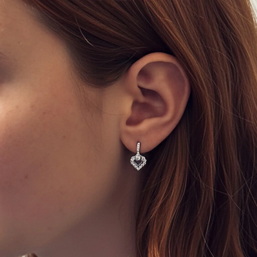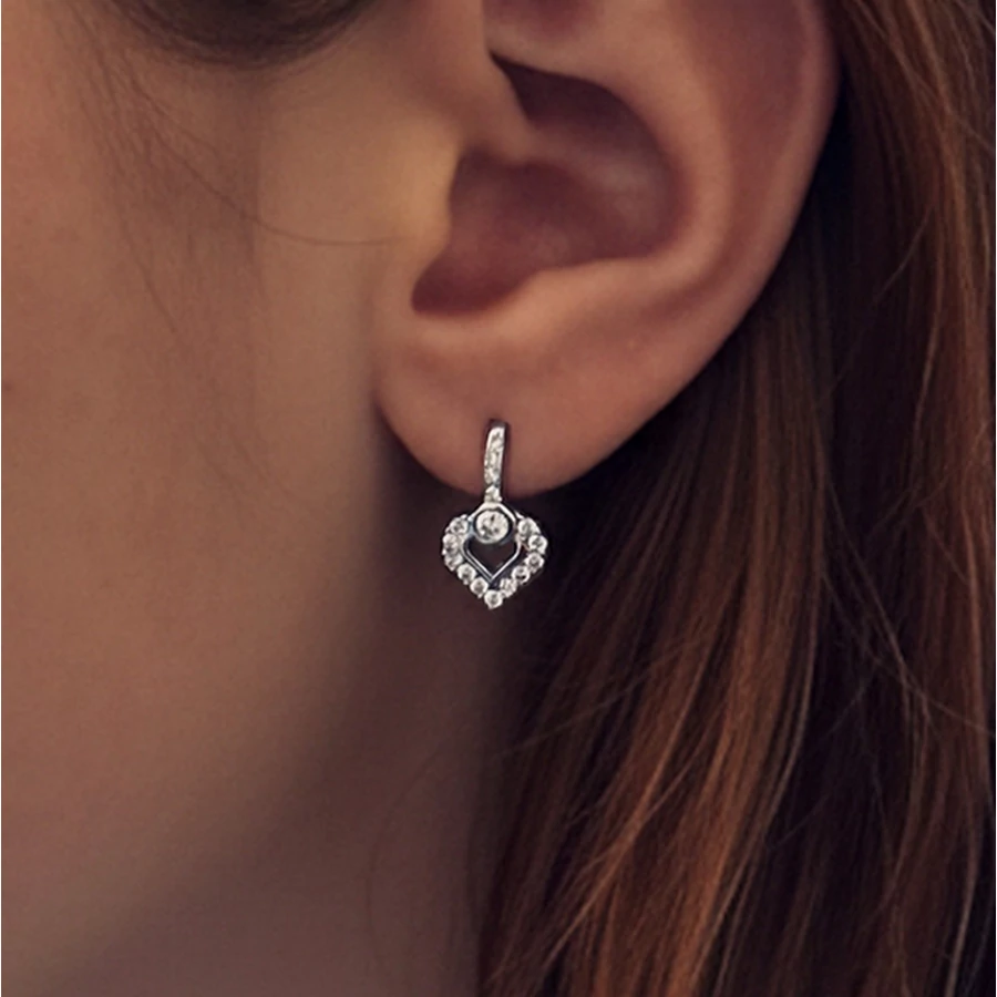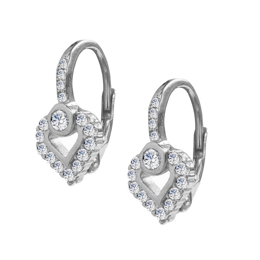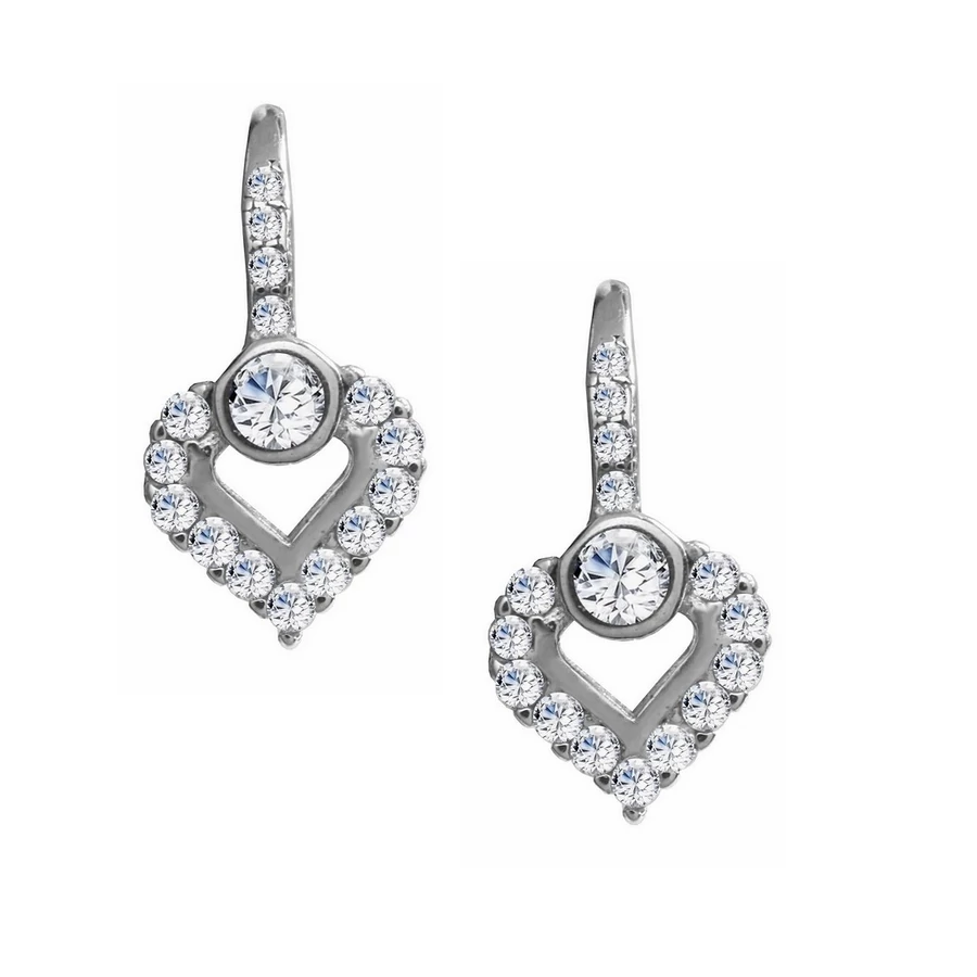 Az ezüst fülbevaló díszítése : szív forma közepén 2 mm cirkónia kő, körülötte apró szikrázóan csillogó cirkónia kövekkel díszítve