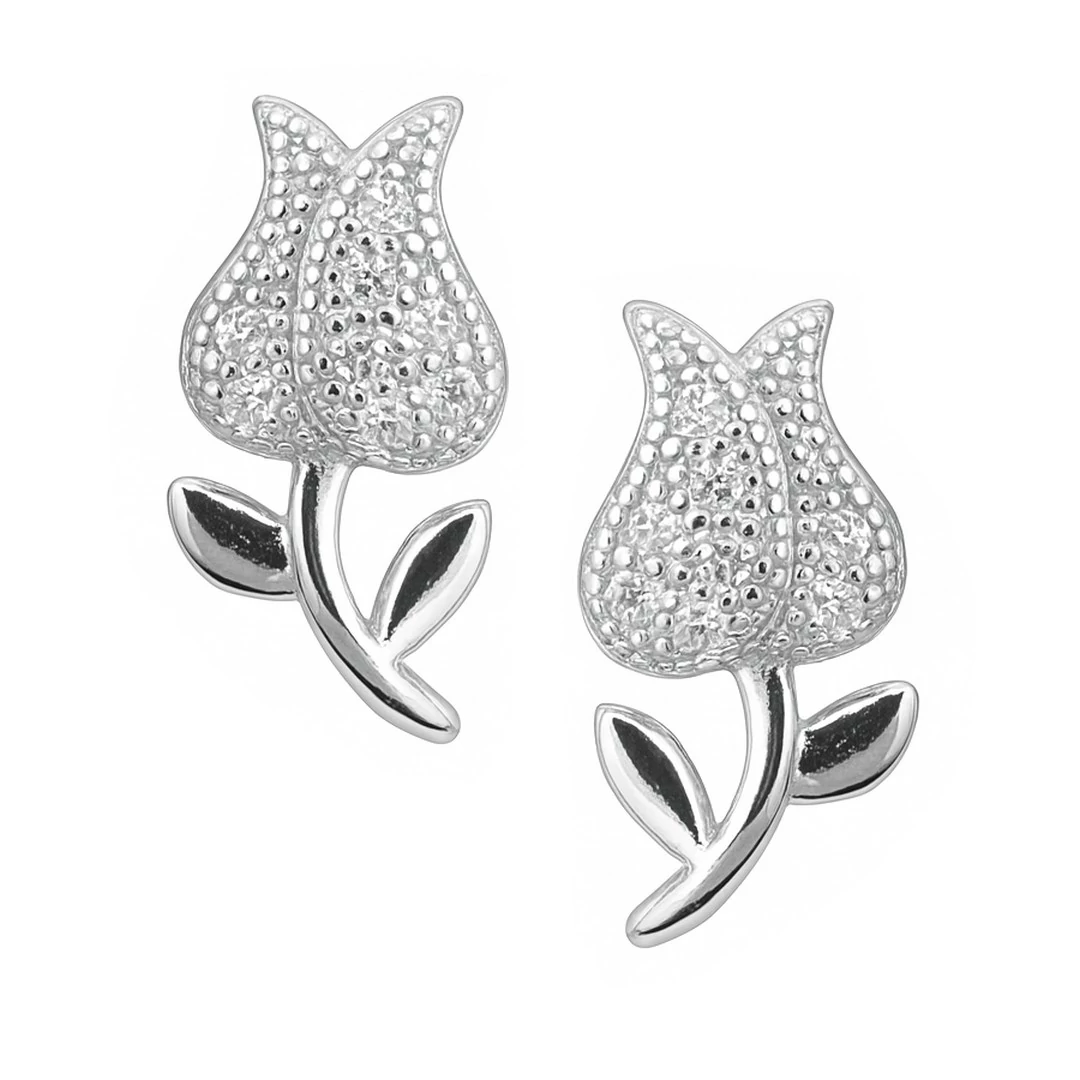 Az ezüst fülbevaló díszítése : egy tulipán virág forma mely szikrázóan csillogó fehér cirkónia kövekkel díszített