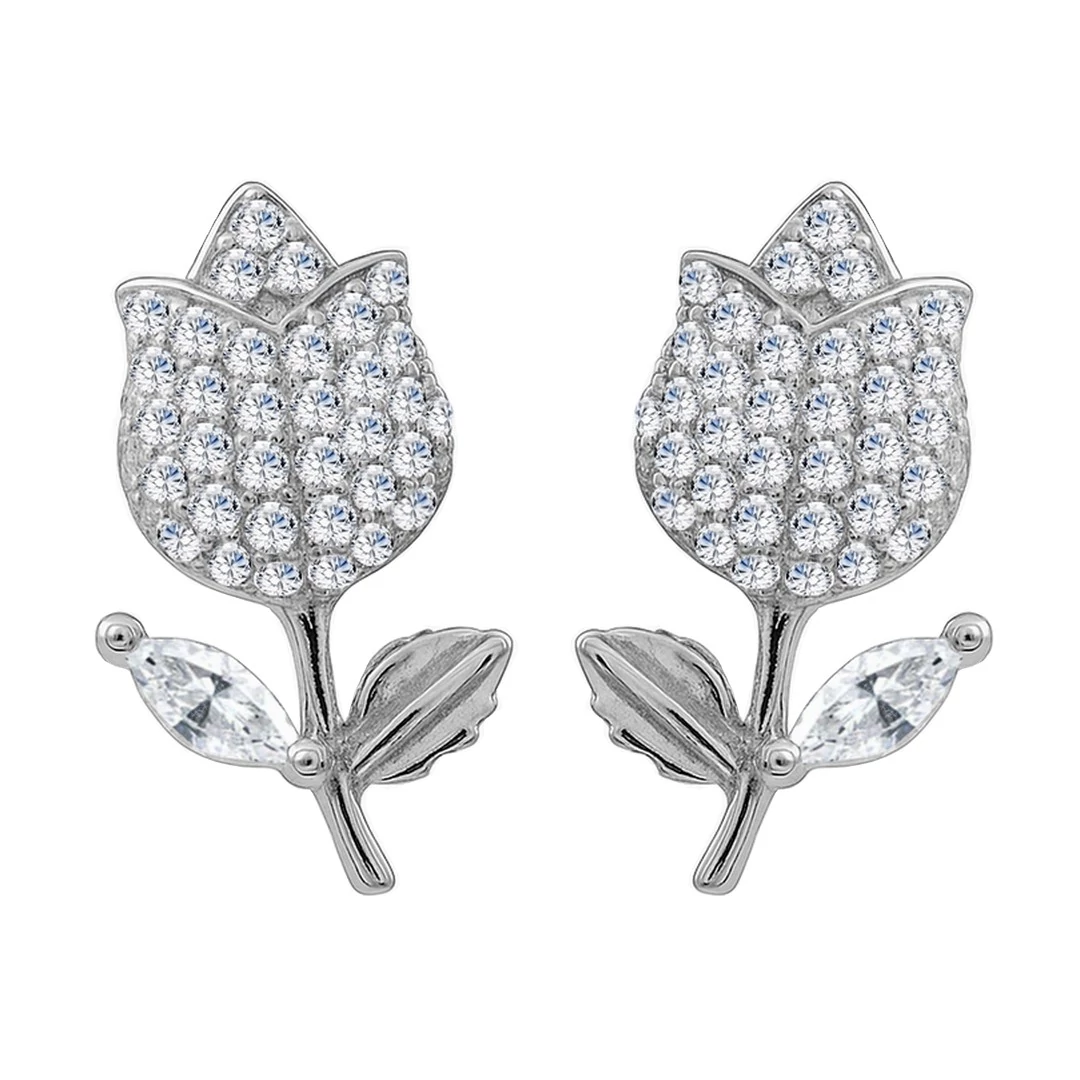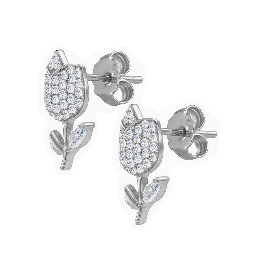 Az ezüst fülbevaló díszítése : egy tulipán virág forma mely szikrázóan csillogó fehér cirkónia kövekkel díszített