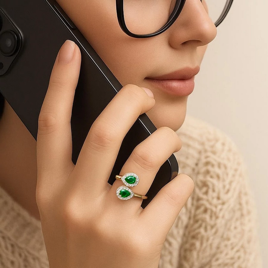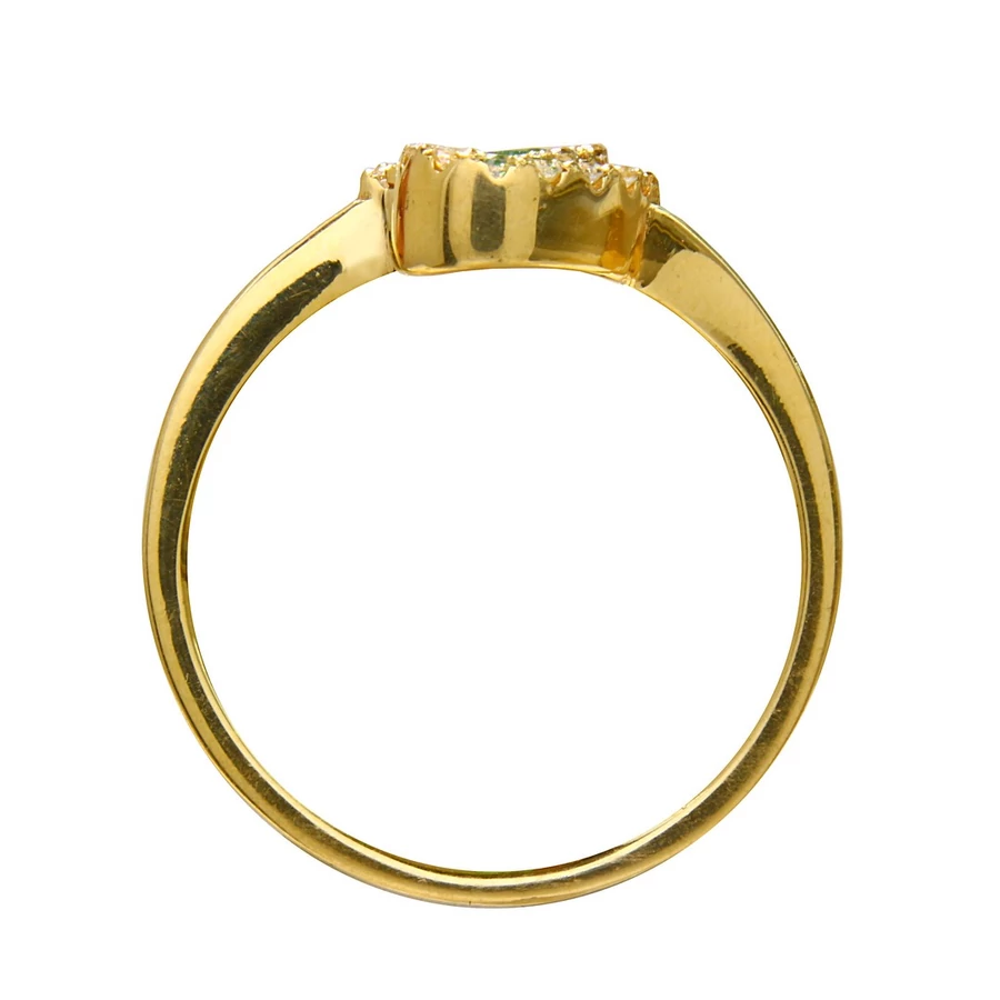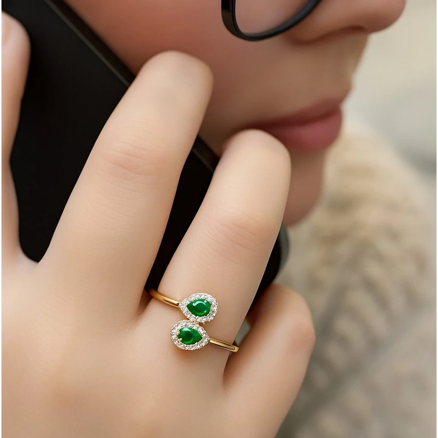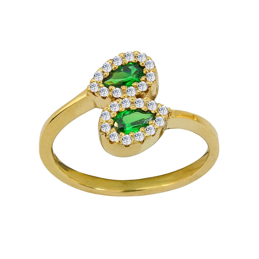 Az arany gyűrű díszítése : smaragdzöld színű csepp alakú kövek, körben apró fehér cirkónia kövekkel díszítve