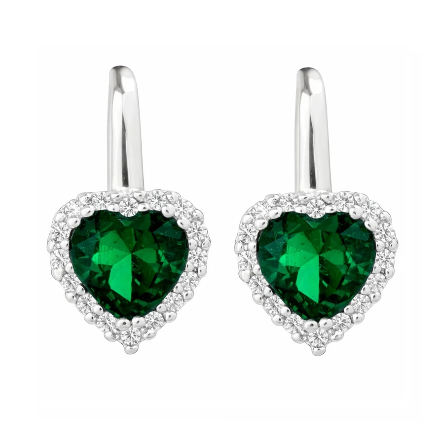 Az ezüst fülbevaló díszítése: egy szív alakú szintetikus smaragd kő, körülötte különleges mikrotechnológiás foglalással foglalt szikrázóan csillogó apró cirkónia kövek